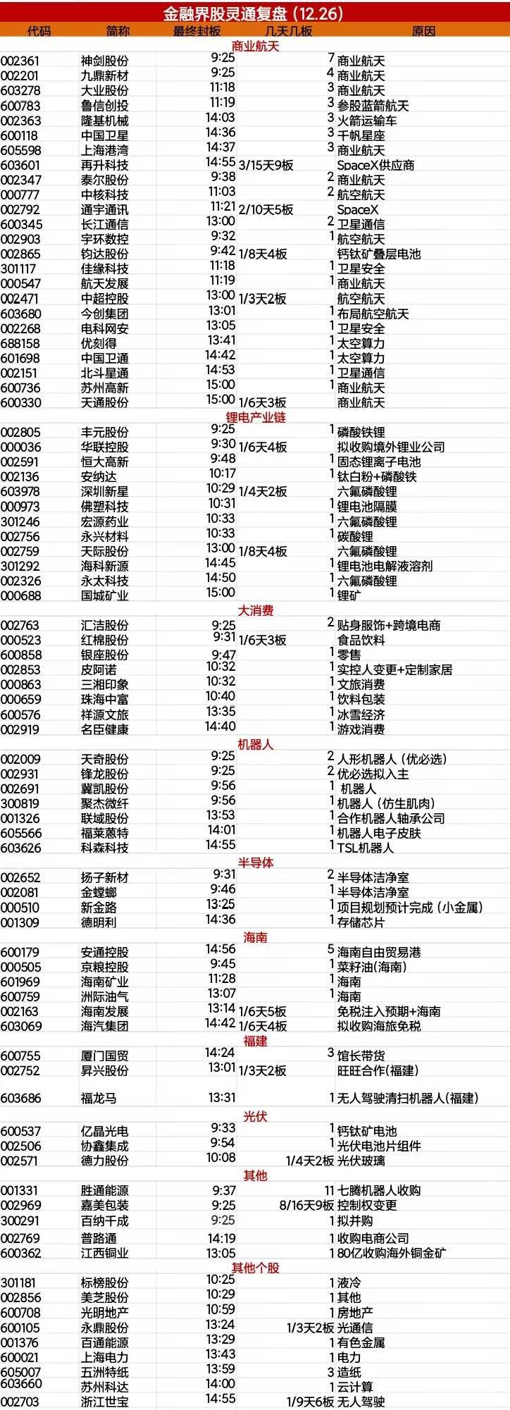 从板块来看,商业航天概念再度爆发,神剑股份7连板,中国卫星3连板,通宇通讯、隆基机械、上海港湾等十余股涨停。锂电产业链走强,天际股份4天3板,佛塑科技、丰元股份、永兴材料涨停。海南自贸概念反复活跃,海南发展6天5板,洲际油气、京粮控股涨停。福建板块局部拉升,厦门国贸3连板。