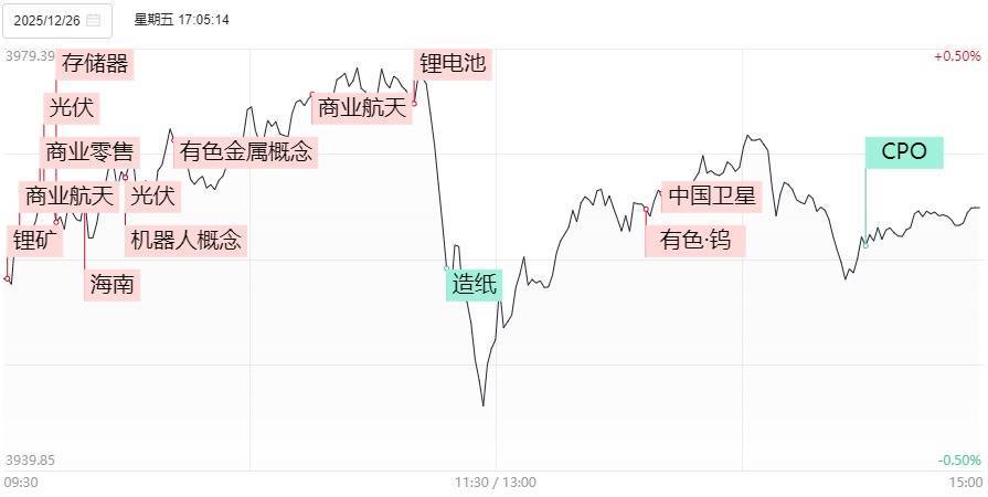 12月26日,A股三大股指早盘冲高回落,沪指及创业板指一度双双转绿,午后股指再度冲高后保持窄幅震荡走势,截止收盘,沪指涨0.1%报3963.68点,深成指涨0.54%报13603.89点,创业板指涨0.14%报3243.88点,科创50指数跌0.24%报1345.83点;全市场成交额2.18万亿元,超1400股上涨。